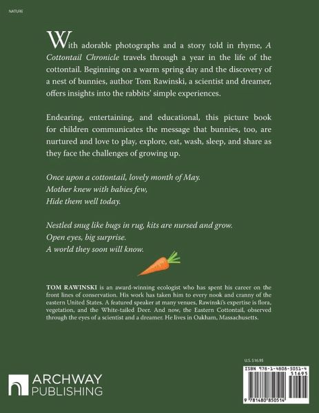 With adorable photographs and a story told in rhyme, A Cottontail Chronicle travels through a year in the life of the cottontail. Beginning on a warm spring day and the discovery of a nest of bunnies, author Tom Rawinski, a scientist and dreamer, offers insights into the rabbits’ simple experiences. Endearing, entertaining, and educational, this picture book for children communicates the message that bunnies, too, are nurtured and love to play, explore, eat, wash, sleep, and share as they face the challenges of growing up. Once upon a cottontail, lovely month of May. Mother knew with babies few, Hide them well today. Nestled snug like bugs in rug, kits are nursed and grow. Open eyes, big surprise. A world they soon will know.