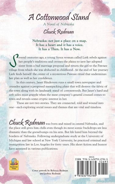 Nebraska: not just a place on a map. It has a heart and it has a voice. It has a Then. It has a Now. Several centuries ago, a young Sioux woman called Lark rebels against her people's traditions and crosses the plains to save her adopted sister from a bad marriage proposal and return the girl to the Pawnee village from which she was abducted in childhood. At the end of her journey Lark finds herself the center of a mysterious Pawnee ritual that undermines her plan as well as her confidence. In this century, Janet Hinderson runs a small town newspaper and crusades against a proposed meatpacking plant that will destroy the fabric of the town along with its landmark stand of cottonwoods. But Janet's hard and soft sides must grapple when the meat company's general counsel comes to town and reveals some cryptic interest in her. These are not two stories. They are connected, told and wound into one--each exploring social issues and themes that are vital and timeless.