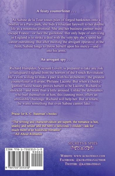 A feisty counterfeiter and a cocky British agent clash in this sultry Secrets and Spies novel by K. C. Bateman, whose witty, intelligent, and sexy historical romances have become her signature. As Sabine de la Tour tosses piles of forged banknotes onto a bonfire in a Paris park, she bids a reluctant farewell to her double life as a notorious criminal. Over the course of Napoleon's reign, her counterfeits destabilized the continent and turned scoundrels into rich men, but now she and her business partner must escape France-or face the guillotine. Her only hope of surviving in England is to strike a deal with the very spy she's spent her career outrunning. Now after meeting the arrogant operative in the flesh, Sabine longs to throw herself upon his mercy-and into his arms. Richard Hampden, Viscount Lovell, is prepared to take any risk to safeguard England from the horrors of the French Revolution. To lure the insurgents out from the shadows, he's even willing to make a pact with his archenemy: Philippe Lacorte, the greatest counterfeiter in Europe. But when a cheeky, gamine-faced beauty proves herself to be Lacorte, Richard is shocked-and more than a little aroused. Unlike the debutantes who so often hurl themselves at him, this cunning minx offers a unique and irresistible challenge. Richard will help her. But in return, he wants something that even Sabine cannot fake. Look for all of K. C. Bateman's delightful Secrets and Spies novels: TO STEAL A HEART A RAVEN'S HEART A COUNTERFEIT HEART "If secretly having the hots for someone and being forced to live in close proximity to them' was an actual trope, it would be my favorite. Everyone in romancelandia knows what living together means: the tension ratchets up, the lust reaches a boiling point and eventually someone or something has to give. God, when it's well done, it's the best. Good news friends, it's well done in A Counterfeit Heart." - All About Romance desert Island Keeper "Scintillating! Clever characters and sizzling romance!" - Publishers Weekly, STARRED REVIEW on This Earl Of Mine. "Rich with espionage and suspense . . . Multidimensional believable characters and fast-paced plotting propel the story forward to its moving conclusion."-Publishers Weekly, on To Steal a Heart "I couldn't ask for much more in an historical romance and I'm eagerly awaiting whatever Ms. Bateman comes up with next."-All About Romance, on To Steal a Heart