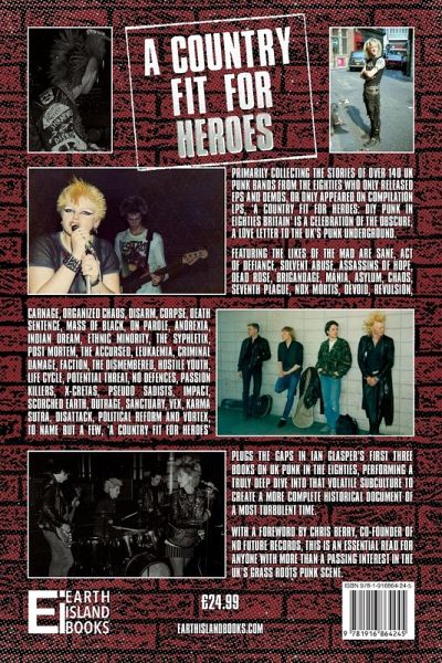 A COUNTRY FIT FOR HEROES : DIY Punk in Eighties Britain by Ian Glasper ¿¿¿PRIMARILY COLLECTING THE STORIES OF OVER 140 UK PUNK BANDS FROM THE EIGHTIES WHO ONLY RELEASED EPS AND DEMOS, OR ONLY APPEARED ON COMPILATION LPS, 'A COUNTRY FIT FOR HEROES: DIY PUNK IN EIGHTIES BRITAIN' IS A CELEBRATION OF THE OBSCURE, A LOVE LETTER TO THE UK'S PUNK UNDERGROUND. ¿¿FEATURING THE LIKES OF THE MAD ARE SANE, ACT OF DEFIANCE, SOLVENT ABUSE, ASSASSINS OF HOPE, DEAD ROSE, BRIGANDAGE, MANIA, ASYLUM, CHAOS, SEVENTH PLAGUE, NOX MORTIS, DEVOID, REVULSION, CARNAGE, ORGANIZED CHAOS, DISARM, CORPSE, DEATH SENTENCE, MASS OF BLACK, ON PAROLE, ANOREXIA, INDIAN DREAM, ETHNIC MINORITY, THE SYPHLETIX, POST MORTEM, THE ACCURSED, LEUKAEMIA, CRIMINAL DAMAGE, FACTION, THE DISMEMBERED, HOSTILE YOUTH, LIFE CYCLE, POTENTIAL THREAT, NO DEFENCES, PASSION KILLERS, X-CRETAS, PSEUDO SADISTS, IMPACT, SCORCHED EARTH, OUTRAGE, SANCTUARY, VEX, KARMA SUTRA, DISATTACK, POLITICAL REFORM AND VORTEX, TO NAME BUT A FEW, 'A COUNTRY FIT FOR HEROES' PLUGS THE GAPS IN IAN GLASPER'S FIRST THREE BOOKS ON UK PUNK IN THE EIGHTIES, PERFORMING A TRULY DEEP DIVE INTO THAT VOLATILE SUBCULTURE TO CREATE A MORE COMPLETE HISTORICAL DOCUMENT OF A MOST TURBULENT TIME. WITH A FOREWORD BY CHRIS BERRY, CO-FOUNDER OF NO FUTURE RECORDS, THIS IS AN ESSENTIAL READ FOR ANYONE WITH MORE THAN A PASSING INTEREST IN THE UK'S GRASS ROOTS PUNK SCENE.