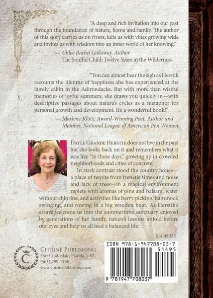 Dayle Grande Herstik does not live in the past but looks back on it and remembers what it was like "in those days," growing up in crowded neighborhoods and cities of concrete. In stark contrast stood the country house—a place of respite from frenetic times and noise, and lack of trees—in a magical environment replete with aromas of pine and balsam, water without chlorine, and activities like berry picking, hammock swinging, and rowing in a big wooden boat. As Herstik’s essays welcome us into the summertime sanctuary enjoyed by generations of her family, nature’s lessons unfold before our eyes and help us all lead a balanced life.