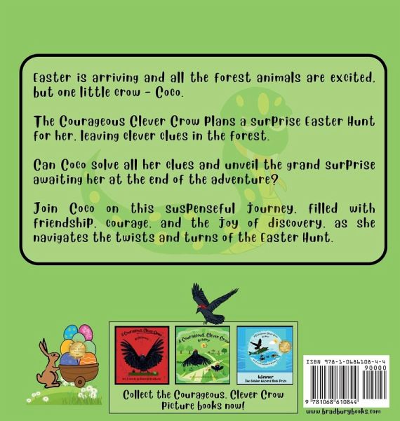 In this Children¿s book, our Courageous, Clever Crow plans a surprise Easter Hunt for one of his young feathered friends Coco, leaving clever clues in the forest. Coco follows the trail, solving challenges set by friends, leading to a joyous grand surprise. Filled with heartwarming moments, this charming story highlights the joy of Easter, the importance of positivity, and happiness derived from sharing and caring for others. Get ready for a heartening tale that captures the spirit of the season and leaves readers with a warm and joyful feeling. Book details:Adorable, colourful illustrations. Examples of support and teamwork. A message celebrating positivity, perseverance and happiness. A excellent resource for parents and teachers, Bonus: Easter I spy activity and an Easter Egg Hunt design.