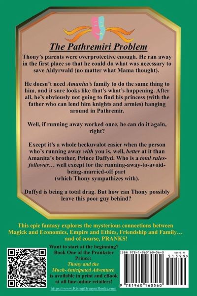 Prince Thony has quickly realized that Amanita's homeland is not where he needs to be - but the matriarchy doesn't want to let him go. So, he has to run away again, this time taking Amanita's brother, Prince Daffyd with him, and heading to the Land of Snow-Fairies, where Puck's mom is the Queen... and a Goddess... ********** Thony's parents were overprotective enough. He ran away in the first place so that he could do what was necessary to save Aldyrwald (no matter what Mama thought). He doesn't need Amanita's family to do the same thing to him, and it sure looks like that's what's happening. After all, he's obviously not going to find his princess (with the father who can lend him knights and armies) hanging around in Pathremir. Well, if running away worked once, he can do it again, right? Except it's a whole heckuvalot easier when the person who's running away with you is, well, better at it than Amanita's brother, Prince Daffyd. Who is a total rules-follower... well except for the running-away-to-avoid-being-married-off part (which Thony sympathizes with). Daffyd is being a total drag. But how can Thony possibly leave this poor guy behind? This epic fantasy explores the mysterious connections between Magick and Economics, Empire and Ethics, Friendship and Family... and of course, PRANKS! Want to start at the beginning? Book One of the Prankster Prince: Thony and the Much-Anticipated Adventure is available in print and eBook at all fine online retailers! ******** Teaser: Thony winced. "NOT. I'm not interested in anyone, guy or girl. I don't have the right to be interested," he began. "Your Big Quest, yadda, yadda, yadda," Daffyd rolled his eyes. "It's to find someone to marry you, right?" "A princess," Thony clarified. "Whose dad will lend me his army to protect Aldyrwald." "Someone," Daffyd corrected. "And how much of an 'army' do you need anyways? A dozen knights and maybe a couple hundred regular troops? Or the equivalent?" Thony blinked. He hadn't actually thought about numbers. "About that, I suppose," he admitted, after thinking about it for a moment. "More wouldn't hurt, though." It wasn't likely there was anyone in the Mountain-Region who would know how to manage terribly large forces. "You think too much," Daffyd said as Thony ruminated on these new ideas. And then Thony found himself being kissed without asking. Again. And it was still the same problem. He didn't want to hurt Daffyd. He just wanted to be asked.