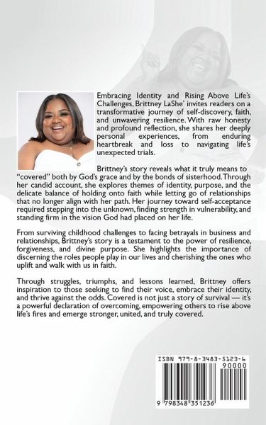 A Covered Girl Story, Brittney LaShe' takes readers on a heartfelt journey of self-discovery, healing, and empowerment. With raw honesty and vulnerability, she shares the trials and triumphs that shaped her into a woman who has learned to embrace her worth, honor her faith, and draw strength from even the most challenging seasons of life. Brittney invites readers into her deeply personal experiences, from moments of loss and betrayal to the challenges of navigating relationships, setting boundaries, and finding purpose. Guided by her unshakable faith in God, she uncovers the resilience within herself to overcome life's obstacles and transform pain into purpose. Along the way, she learns the value of true sisterhood, the necessity of letting go of what no longer serves her, and the beauty of reclaiming her identity through God's grace. This book is more than a story it's a guide and inspiration for anyone seeking to find their voice, embrace their worth, or step fully into their purpose. Through Brittney's journey, readers will find hope, wisdom, and a powerful reminder that God's love is ever-present, covering us even in life's toughest moments. A Covered Girl Story is a testament to faith, resilience, and the transformational power of living a life covered by His grace.