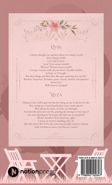 RYAN: I always thought my opinion about two things would never change in life. Love and women. Love? Love means trouble! Women? Women mean trouble! Loving a woman with all your heart? Double trouble! At least, so I thought. But then things spiralled after she(italics) came sprinting into my life. Resolves, forgotten. Promises, made. Hearts, broken and opinions about love? Well, forever changed!! MYZA: Falling in love with the guy was the last thing on my to-do list for life, after seeing my cousin heartbroken over a male species. They all are the same. At least, so I thought. And then he(italics) came into my life, proving me wrong at every step of the way; showing me how guys like him are an exception! All this shouldn't have fazed me, right? I mean we weren't anything after all. But who knew that I'd be the same emotionally sensitive woman with attachment issues, just like my cousin?