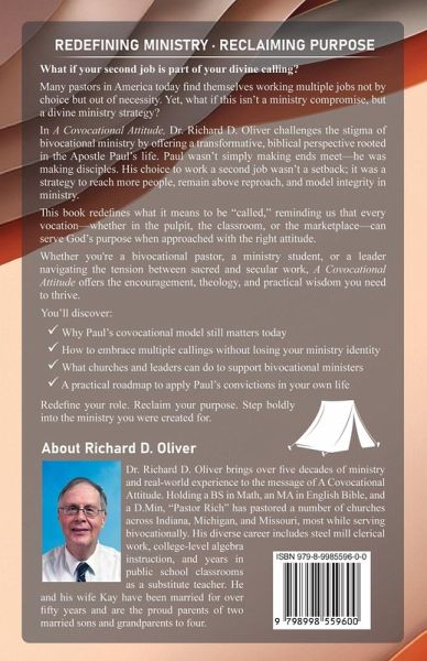 REDEFINING MINISTRY · RECLAIMING PURPOSE What if your second job isn't a detour-but a divine strategy? Across centuries and cultures, pastors have often balanced their ministry with other vocations. In A Covocational Attitude, Dr. Richard D. Oliver explores a radical but biblically grounded mindset that redefines how ministers view their callings, work, and identity in a rapidly changing world. At the book's heart lies a challenging and often controversial question: Is bivocational ministry a burden... or a strategic blessing? Too often, the conversation around bivocational ministry is shaped by stigma, scarcity, and survival. Churches struggling to pay full-time salaries, pastors fighting burnout and self-doubt, and a theological culture that silently ranks ministers by their funding. But what if we've missed the bigger picture? Oliver uncovers a powerful biblical model by tracing the life and motivations of the Apostle Paul-who intentionally chose covocational ministry. Paul's convictions weren't driven by need but by strategy: to reach more people, to remain above reproach, to model integrity, and to remove cultural barriers to the gospel. What if today's ministers could do the same? Whether you're a bivocational pastor, a ministry student, a church leader, or someone feeling torn between sacred and secular work, this book is for you. A Covocational Attitude will help you reframe your calling, find peace in your purpose, and confidently lead-no matter how many hats you wear. This book is for you if: ¿¿ You're a pastor struggling with identity or legitimacy in bivocational ministry. ¿¿ You're exploring how to integrate your faith with your work life. ¿¿ You want a biblical and strategic lens to view ministry in modern contexts. ¿¿ You're looking for practical insights grounded in Paul's own ministry choices. ¿¿ You're a church leader, seminary professor, or denominational overseer seeking to support ministers with empathy and wisdom. ¿¿ You long to rediscover joy, calling, and clarity in every corner of your work. Get ready to adopt the attitude that changed Paul's ministry-and could reshape yours.