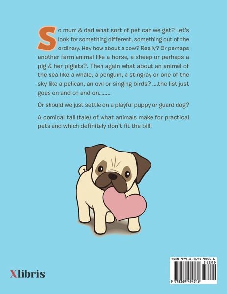 So mum & dad what sort of pet can we get? Let's look for something different, something out of the ordinary. Hey how about a cow? Really? Or perhaps another farm animal like a horse, a sheep or perhaps a pig & her piglets?. Then again what about an animal of the sea like a whale, a penguin, a stingray or one of the sky like a pelican, an owl or singing birds? ....the list just goes on and on and on........ Or should we just settle on a playful puppy or guard dog? A comical tail (tale) of what animals make for practical pets and which definitely don't fit the bill!