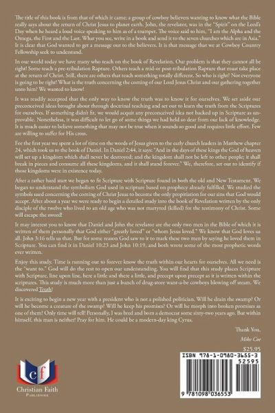 The title of this book is from that of which it came; a group of cowboy believers wanting to know what the Bible really says about the return of Christ Jesus to planet earth. John, the revelator, was in the "Spirit" on the Lord's Day when he heard a loud voice speaking to him as of a trumpet. The voice said to him, "I am the Alpha and the Omega, the First and the Last. What you see, write in a book and send it to the seven churches which are in Asia." It is clear that God wanted to get a message out to the believers. It is that message that we at Cowboy Country Fellowship seek to understand. In our world today we have many who teach on the book of Revelation. Our problem is that they cannot all be right! Some teach a pre-tribulation Rapture. Others teach a mid-or post-tribulation Rapture that must take place at the return of Christ. Still, there are others that teach something totally different. So who is right? Not everyone is going to be right! What is the truth concerning the coming of our Lord Jesus Christ and our gathering together unto him? We wanted to know! It was readily accepted that the only way to know the truth was to know it for ourselves. We set aside our preconceived ideas brought about through doctrinal teaching and set out to learn the truth from the Scriptures for ourselves. If something didn't fit, we would acquit any preconceived idea not backed up in Scripture as un-provable. Nonetheless, it was difficult to let go of some things we had held so dear from our lack of knowledge. It is much easier to believe something that may not be true when it sounds so good and requires little effort. Few are willing to suffer for His cross. For the first year we spent a lot of time on the words of Jesus given to the early church leaders in Matthew chapter 24, which took us to the book of Daniel. In Daniel 2:44, it says: "And in the days of these kings the God of heaven will set up a kingdom which shall never be destroyed; and the kingdom shall not be left to other people; it shall break in pieces and consume all these kingdoms, and it shall stand forever." We, therefore, set out to identify if those kingdoms were in existence today. After a rather hard start we began to fit Scripture with Scripture found in both the old and New Testament. We began to understand the symbolism God used in scripture based on prophecy already fulfilled. We studied the symbols used concerning the coming of Christ Jesus to become the only propitiation for our sins that God would accept. After about a year we were ready to begin a detailed study into the book of Revelation written by the only disciple of the twelve who lived to an old age who was not martyred (killed) for the testimony of Christ. Some will escape the sword! It may interest you to know that Daniel and John the revelator are the only two men in the Bible of which it is written of them personally that God either "greatly loved" or "whom Jesus loved." We know that God loves us all. John 3:16 tells us that. But for some reason God saw to it to mark these two men by saying he loved them in Scripture. You can find it in Daniel 10:23 and John 10:19, and both wrote some of the most prophetic words ever written. Enjoy this study. Time is running out to forever know the truth within our hearts for ourselves. All we need is the "want to." God will do the rest to open our understanding. You will find that this study places Scripture with Scripture, line upon line, here a little and there a little, and precept upon precept as it is written within the scriptures. This study is much more than just a bunch of drug-store want-a-be cowboys blowing off steam. We discovered Truth! It is exciting to begin a new year with a president who is not a polished politician. Will he drain the swamp? Or will he become a creature of the swamp? Will he keep his promises? Or will he morph into broken promises as one of