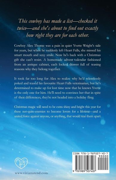 This cowboy has made a list-checked it twice-and she's about to find out exactly how right they are for each other. A standalone holiday story from New York Times bestselling author Vivian Arend. Cowboy Alex Thorne was a pain in quiet Yvette Wright's side for years, but when he suddenly left Heart Falls, she missed his smart mouth and sexy smile. Now he's back with a Christmas gift she can't resist. A homemade advent calendar fashioned from an antique desk, each locked drawer full of teasing reasons why they belong together. It took far too long for Alex to realize why he'd relentlessly poked and teased his favourite Heart Falls veterinarian, but he's determined to make up for lost time now that he knows Yvette is the only one for him. He'll need to convince her that in spite of their differences, they're not headed into a holiday fling. Christmas magic will need to be extra shiny and bright this year for these not-quite-enemies to become lovers for a lifetime-and a united force against anyone, or anything, that would tear them apart.