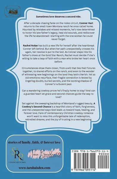 Sometimes love deserves a second ride. Can a broken cowboy find his way home? Can a guarded heart learn to love again? After ten years of chasing fame and glory on the rodeo circuit, Conner Hart returns to his childhood home, the Gold Star Ranch in Montana. His father's passing has brought him back to the land he abandoned, and Conner is determined to right the wrongs of his past, including the mistakes that cost him the only woman he's ever loved. Rachel Nolan has carved out a life of independence and purpose. But when Conner unexpectedly returns to Riverbend Valley, he stirs up emotions she thought she'd buried long ago. Forced to work together on the ranch that holds so much history for both their families, Rachel struggles to determine if Conner truly is a changed man or if he'll break her heart for a second time. As they face shared challenges-keeping the ranch running, fulfilling a surprising stipulation in Conner's father's will, and reconnecting with a community full of watchful eyes-old wounds resurface, secrets are revealed, and bonds are tested. Through it all, one question lingers: Can grace truly bring redemption to a cowboy who has wandered too far, and can love flourish between two hearts scarred by the past? Set against Montana's breathtaking landscape, A Cowboy's Second Chance is a deeply moving story of love, loss, and the extraordinary power of forgiveness. With themes of faith, hope, and finding God's perfect timing amid life's trials, this heartwarming contemporary Christian cowboy romance is perfect for fans of small-town love stories, rekindled dreams, and characters striving for second chances in life and love. If you're a fan of sweeping sunsets, small-towns, rugged cowboys, and tender redemption stories, don't miss this unforgettable tale that will inspire your heart and lift your spirit. Grab your copy of A Cowboy's Second Chance today and discover how faith, love, and second chances can transform even the most broken of hearts.