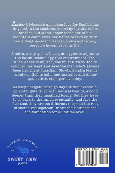 Asher Clyborne's unspoken love for Sondra has lingered in the shadows, veiled by loyalty to his brother. But when Asher takes her to his mountain cabin after her fiance breaks up with her, a freak accident leaves Sondra as the only person who can save his life. Sondra, a city girl at heart, struggles to adjust to the harsh, technology-free environment. Yet, when Asher is injured, she must turn to God to conquer her fears and save the man who's always been her silent guardian. Slowly, Sondra learns to rely on God to calm her anxieties and Asher gets a little stronger each day. As they navigate through days without electricity and nights filled with natural beauty, a bond deeper than they imagined forms. But they have to go back to the ranch eventually, and face the fact that they are too different to spend the rest of their lives together. Or are their differences the foundation for a lifetime love?