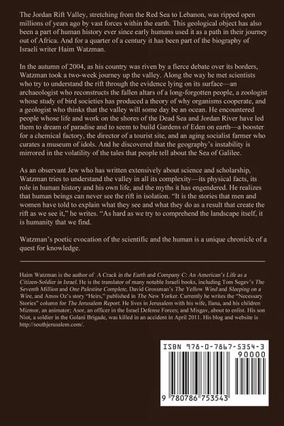 The Jordan Rift Valley, stretching from the Red Sea to Lebanon, was ripped open millions of years ago by vast forces within the earth. This geological object has also been a part of human history ever since early humans used it as a path in their journey out of Africa. And for a quarter of a century it has been part of the biography of Israeli writer Haim Watzman. In the autumn of 2004, as his country was riven by a fierce debate over its borders, Watzman took a two-week journey up the valley. Along the way he met scientists who try to understand the rift through the evidence lying on its surface?an archaeologist who reconstructs the fallen altars of a long-forgotten people, a zoologist whose study of bird societies has produced a theory of why organisms cooperate, and a geologist who thinks that the valley will some day be an ocean. He encountered people whose life and work on the shores of the Dead Sea and Jordan River have led them to dream of paradise and to seem to build Gardens of Eden on earth?a booster for a chemical factory, the director of a tourist site, and an aging socialist farmer who curates a museum of idols. And he discovered that the geography's instability is mirrored in the volatility of the tales that people tell about the Sea of Galilee. As an observant Jew who has written extensively about science and scholarship, Watzman tries to understand the valley in all its complexity?its physical facts, its role in human history and his own life, and the myths it has engendered. He realizes that human beings can never see the rift in isolation. ?It is the stories that men and women have told to explain what they see and what they do as a result that create the rift as we see it,? he writes. ?As hard as we try to comprehend the landscape itself, it is humanity that we find. Watzman's poetic evocation of the scientific and the human is a unique chronicle of a quest for knowledge. Finalist, Sami Rohr Prize for Jewish Literature, 2008.