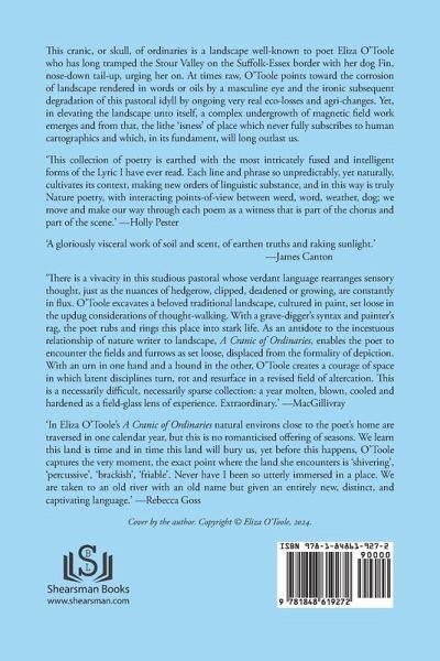 This cranic, or skull, of ordinaries is a landscape well-known to poet Eliza O'Toole who has long tramped the Stour Valley on the Suffolk-Essex border with her dog Fin, nose-down tail-up, urging her on. In the muddy paint-water of John Constable and the rambling madness of John Clare, O'Toole takes her own step lightly into a calendar year of a landscape displaced. Chronicling the cycle of seasons, book-ended by (poisonous) aconites, these poems are decisive moments in time that mark life-death-decay, as a series of alternative, textual landscape paintings. At times raw, O'Toole points toward the corrosion of landscape rendered in words or oils by a masculine eye and the ironic subsequent degradation of this pastoral idyll by ongoing very real eco-losses and agri-changes. Yet, in elevating the landscape unto itself, a complex undergrowth of magnetic field work emerges and from that, the lithe 'isness' of place which never fully subscribes to human cartographics and which, in its fundament, will long outlast us. 'This collection of poetry is earthed with the most intricately fused and intelligent forms of the Lyric I have ever read. Each line and phrase so unpredictably, yet naturally, cultivates its context, making new orders of linguistic substance, and in this way is truly Nature poetry, with interacting points-of-view between weed, word, weather, dog; we move and make our way through each poem as a witness that is part of the chorus and part of the scene.' -Holly Pester 'A gloriously visceral work of soil and scent, of earthen truths and raking sunlight.' -James Canton 'There is a vivacity in this studious pastoral whose verdant language rearranges sensory thought, just as the nuances of hedgerow, clipped, deadened or growing, are constantly in flux. O'Toole excavates a beloved landscape with her attendant animal, a traditional landscape cultured in paint, set loose in the updug considerations of thought-walking. With a grave-digger's syntax and painter's rag, the poet rubs and rings this place into stark life. As an antidote to the incestuous relationship of nature writer to landscape, A Cranic of Ordinaries, enables the poet to encounter the fields and furrows as set loose, displaced from the formality of depiction. With an urn in one hand and a hound in the other, O'Toole creates a courage of space in which latent disciplines turn, rot and resurface in a revised field of altercation. This is a necessarily difficult, necessarily sparse collection: a year molten, blown, cooled and hardened as a field-glass lens of experience. Extraordinary.' -MacGillivray 'In Eliza O'Toole's A Cranic of Ordinaries natural environs close to the poet's home are traversed in one calendar year, but this is no romanticised offering of seasons. We learn This land is time and in time this land will bury us, yet before this happens, O'Toole captures the very moment, the exact point where the land she encounters alongside her beloved dog Fin, is 'shivering', 'percussive', 'brackish', 'friable'. Never have I been so utterly immersed in a place. We are taken to an old river with an old name but given an entirely new, distinct, and captivating language'. -Rebecca Goss