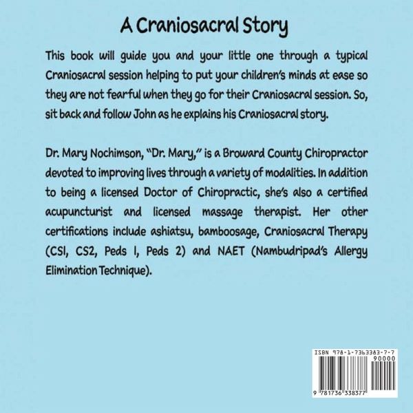 My name is Dr. Mary Nochimson. I am a Chiropractor since 2011 licensed in massage and certified in Craniosacral and Acupuncture. I found that it is as important for me to educate parents as it is for parents to educate their children. Many times, children are left in the dark, and it is very important to explain to them where you are taking them and what is going to happen. With any therapy, this will make a world of difference.This is the first book in a series that will help you and your child understand a little bit more about alternative health care methods, such a Chiropractic, Craniosacral and Acupuncture. This book will help guide you through what may happen during a Craniosacral session. With rhymes and illustrations, this book will help put your childrens' mind at ease so they are not fearful when they go for their Craniosacral session.So, sit back and follow John as he explains his Craniosacral story.