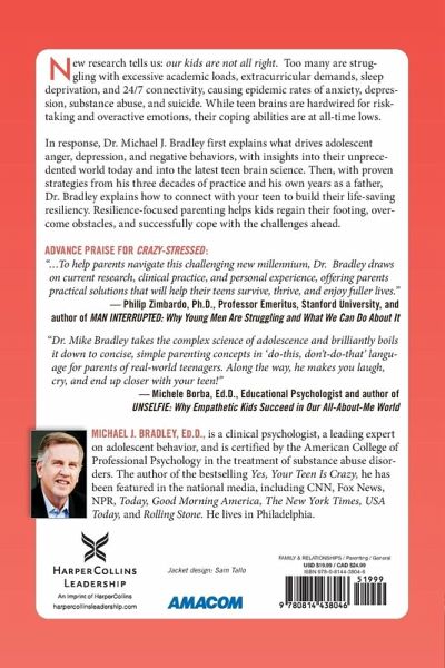 A guide for saving today's overwhelmed teens through love, laughter, and the power of resilience. A little resilience goes a long way, peel back the cheerful facade that parents present, and you'll find that many are worried about their teens. Mood swings, impulsiveness, poor judgment, and other problems peak in these years. Add stressors such as screen addiction, cyberbullying, increasing academic demands, and time-consuming athletic commitments...and it's no surprise that today's teenagers rank as the most anxious in 50 years. Parents long to help, but how? Based on a career counseling kids and their parents, psychologist Michael Bradley locates the most powerful protective trait: resilience. Teens with this crucial quality know how to handle difficulty, overcome obstacles, and bounce back from setbacks. Packed with insights from neuroscience and psychology, real-life case studies, and a dose of humor, Crazy-Stressed sheds light on the teen brain and offers a wealth of resiliency-boosting strategies. In it, Dr. Bradley reveals: What kids these days are really going through Ways to strengthen the seven skills every teen needs to survive and thrive What-to-do-when suggestions for common behavior, school, and social issues Tactics for coping with conflict, teaching consequences, improving communication, staying connected, and more It's not easy being a teen-and it's certainly not easy parenting one. Always frank and often funny, Crazy-Stressed will become your go-to guide...and your teens may even thank you for it.