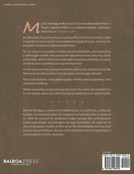 Martin Vierdag looks back at his transformatoin from a Dutch migrant child to a surfboard shaper, craftsman, and artist in A Creative Life. He describes his journey from a surfing life in Victoria, Australia, what it was like to return to his native Holland to study fine arts, and how he became a respected craftsman and artist. On his return to Australia, he held several exhibitions, also becoming a self-taught builder who produced many fine homes featuring stone and timber. All the while, he continued to produce paintings focusing on the human condition and our environment. At the time, not many people found his work to be of interest, but the themes he has focused on have become increasingly relevant. The book includes many photographs of the author's paintings and domestic buildings. While researching and producing this book, the author discovered he is on the autistic spectrum, which he found explained much about his life.