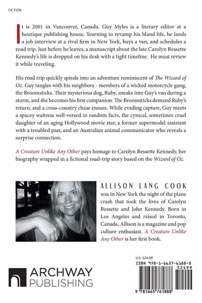 It is 2001 in Vancouver, Canada. Guy Myles is a literary editor at a boutique publishing house. Yearning to revamp his bland life, he lands a job interview at a rival firm in New York, buys a van, and schedules a road trip. Just before he leaves, a manuscript about the late Carolyn Bessette Kennedy's life is dropped on his desk with a tight timeline. He must review it while traveling. His road trip quickly spirals into an adventure reminiscent of The Wizard of Oz. Guy tangles with his neighbors - members of a wicked motorcycle gang, the Broomsticks. Their mysterious dog, Ruby, sneaks into Guy's van during a storm, and she becomes his first companion. The Broomsticks demand Ruby's return, and a cross-country chase ensues. While evading capture, Guy meets a spacey waitress well-versed in random facts, the cynical, sometimes cruel daughter of an aging Hollywood movie star, a former supermodel assistant with a troubled past, and an Australian animal communicator who reveals a surprise connection. A Creature Unlike Any Other pays homage to Carolyn Bessette Kennedy, her biography wrapped in a fictional road-trip story based on the Wizard of Oz.