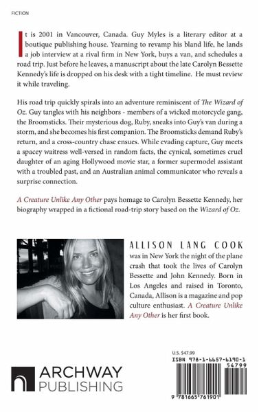 It is 2001 in Vancouver, Canada. Guy Myles is a literary editor at a boutique publishing house. Yearning to revamp his bland life, he lands a job interview at a rival firm in New York, buys a van, and schedules a road trip. Just before he leaves, a manuscript about the late Carolyn Bessette Kennedy's life is dropped on his desk with a tight timeline. He must review it while traveling. His road trip quickly spirals into an adventure reminiscent of The Wizard of Oz. Guy tangles with his neighbors - members of a wicked motorcycle gang, the Broomsticks. Their mysterious dog, Ruby, sneaks into Guy's van during a storm, and she becomes his first companion. The Broomsticks demand Ruby's return, and a cross-country chase ensues. While evading capture, Guy meets a spacey waitress well-versed in random facts, the cynical, sometimes cruel daughter of an aging Hollywood movie star, a former supermodel assistant with a troubled past, and an Australian animal communicator who reveals a surprise connection. A Creature Unlike Any Other pays homage to Carolyn Bessette Kennedy, her biography wrapped in a fictional road-trip story based on the Wizard of Oz.