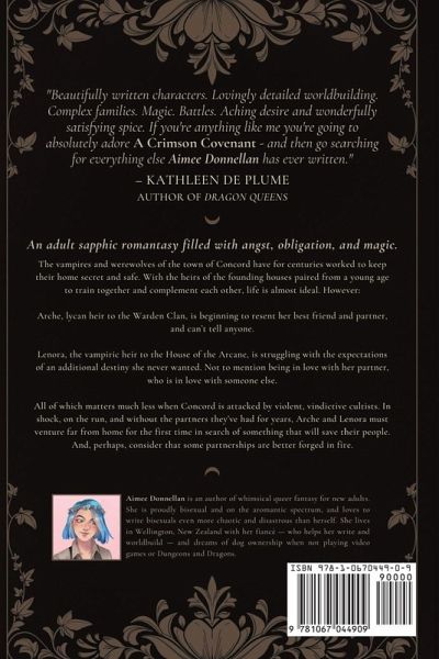 The vampires and werewolves of the town of Concord have for centuries worked to keep their home secret and safe. With the heirs of the founding houses paired from a young age to train together and complement each other, life is almost ideal. However: Arche, lycan heir to the Warden Clan, is beginning to resent her best friend and partner, and can't tell anyone. Lenora, the vampiric heir to the House of the Arcane, is struggling with the expectations of an additional destiny she never wanted. Not to mention being in love with her partner, who is in love with someone else. All of which matters much less when Concord is attacked by violent, vindictive cultists. In shock, on the run, and without the partners they've had for years, Arche and Lenora must venture far from home for the first time in search of something that will save their people. And, perhaps, consider that some partnerships are better forged in fire. A sapphic romantasy filled with angst, obligation and magic.