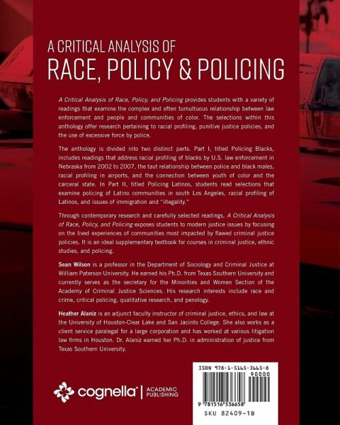 A Critical Analysis of Race, Policy, and Policing provides students with a variety of readings that examine the complex and often tumultuous relationship between law enforcement and people and communities of color. The selections within this anthology offer research pertaining to racial profiling, punitive justice policies, and the use of excessive force by police. The anthology is divided into two distinct parts. Part I, titled Policing Blacks, includes readings that address racial profiling of blacks by U.S. law enforcement in Nebraska from 2002 to 2007, the taut relationship between police and black males, racial profiling in airports, and the connection between youth of color and the carceral state. In Part II, titled Policing Latinos, students read selections that examine policing of Latino communities in south Los Angeles, racial profiling of Latinos, and issues of immigration and "illegality." Through contemporary research and carefully selected readings, A Critical Analysis of Race, Policy, and Policing exposes students to modern justice issues by focusing on the lived experiences of communities most impacted by flawed criminal justice policies. It is an ideal supplementary textbook for courses in criminal justice, ethnic studies, and policing. Sean Wilson is a professor in the Department of Sociology and Criminal Justice at William Paterson University. He earned his Ph.D. from Texas Southern University and currently serves as the secretary for the Minorities and Women Section of the Academy of Criminal Justice Sciences. His research interests include race and crime, critical policing, qualitative research, and penology. Heather Alaniz is an adjunct faculty instructor of criminal justice, ethics, and law at the University of Houston-Clear Lake and San Jacinto College. She also works as a client service paralegal for a large corporation and has worked at various litigation law firms in Houston. Dr. Alaniz earned her Ph.D. in administration of justice from Texas Southern University.