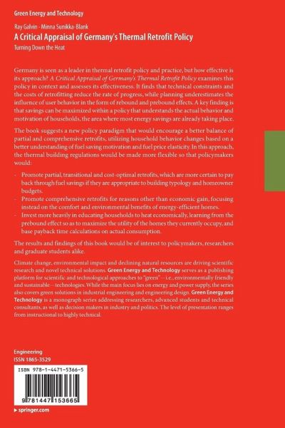 Germany is seen as a leader in thermal retrofit policy and practice, but how effective is its approach? A Critical Appraisal of Germany's Thermal Retrofit Policy examines this policy in context and assesses its effectiveness. It finds that technical constraints and the costs of retrofitting reduce the rate of progress, while planning underestimates the influence of user behavior in the form of rebound and prebound effects. A key finding is that savings can be maximized within a policy that understands the actual behavior and motivation of households, the area where most energy savings are already taking place.