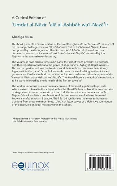 This book presents a critical edition of the twelfth/eighteenth century ah/ce manuscript on the subject of legal maxims ¿Umdat al-N¿zir ¿al¿ al-Ashb¿h wa'l-Nä¿¿ir. It was composed by the distinguished ¿anifite jurist Ab¿ 'l-Sü¿d al-¿usayn¿ and is a commentary on an earlier seminal text Al-Ashb¿h wa'l-Nä¿¿ir', authored by Ibn Nujaym in the tenth/sixteenth century. The volume is divided into three main parts, the first of which provides an historical and theoretical introduction to the genre of al-qaw¿¿id al-fiqhiyyah (legal maxims). The second part introduces the two texts and their authors, discusses their literary legacy within the ¿anaf¿ School of law and covers issues of editing, authenticity and provenance. Finally, the third part of the book consists of seven edited chapters of the ¿Umdat al-N¿zir ¿al¿ al-Ashb¿h wa'l-Nä¿¿ir. The first of these is the author's introduction to his work followed by one for each of the first six qaw¿¿id. The work is important as a commentary on one of the most significant legal texts which revived interest in the subject within the ¿anaf¿ School of law after five centuries of stagnation. It is also the most copious of all the forty-four commentaries on Ibn Nujaym's book and it is a combination of the commentaries of at least three well known ¿anafite scholars. Because Ab¿'l-Sü¿d synthesises the most authoritative opinions from these commentaries, ¿Umdat al-N¿¿ir serves as a definitive summation of the discourse on legal maxims within the school.