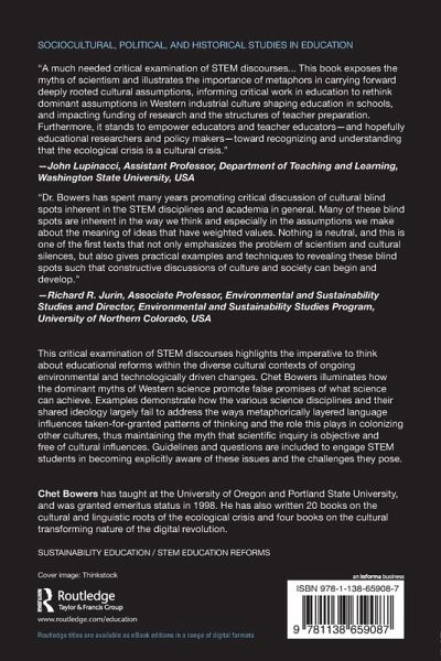 This critical examination of STEM discourses highlights the imperative to think about educational reforms within the diverse cultural contexts of ongoing environmental and technologically driven changes. Chet Bowers illuminates how the dominant myths of Western science promote false promises of what science can achieve. Examples demonstrate how the various science disciplines and their shared ideology largely fail to address the ways metaphorically layered language influences taken-for-granted patterns of thinking and the role this plays in colonizing other cultures, thus maintaining the myth that scientific inquiry is objective and free of cultural influences. Guidelines and questions are included to engage STEM students in becoming explicitly aware of these issues and the challenges they pose.