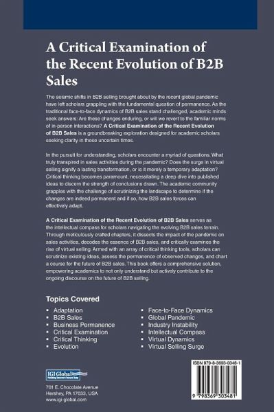 The seismic shifts in B2B selling brought about by the recent global pandemic have left scholars grappling with the fundamental question of permanence. As the traditional face-to-face dynamics of B2B sales stand challenged, academic minds seek answers: Are these changes enduring, or will we revert to the familiar norms of in-person interactions? A Critical Examination of the Recent Evolution of B2B Sales is a groundbreaking exploration designed for academic scholars seeking clarity in these uncertain times. In the pursuit for understanding, scholars encounter a myriad of questions. What truly transpired in sales activities during the pandemic? Does the surge in virtual selling signify a lasting transformation, or is it merely a temporary adaptation? Critical thinking becomes paramount, necessitating a deep dive into published ideas to discern the strength of conclusions drawn. The academic community grapples with the challenge of scrutinizing the landscape to determine if the changes are indeed permanent and if so, how B2B sales forces can effectively adapt.