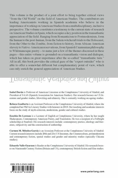 This volume is the product of a joint effort to bring together critical views "from the Old World" on the field of American Studies. The contributors are leading Americanists working in Spanish academia who believe in the importance of working on American Studies from a multidisciplinary, inclusive perspective. The volume constitutes a testimony to the current state of research on American Studies in Spain, which occupies a key position in the transatlantic appreciation of the field. Ranging from Romanticism to Postmodernism, form the human to the post-human, from the Salem witchcraft trials to the Holocaust, from the Other to the Zombie, from fiction to history, from African-American slavery to Native-American reservations, from Spanish Unamunian philosophy to Whitmanesque poetry-to name just a few of the themes discussed in these pages-this entire volume is grounded on a transatlantic vision and dialogue, which has taken on great importance after the so-called "transatlantic turn." All in all, this book provides the critical gaze of the "expert outsider" who is able to offer a somewhat different but complementary point of view, which can only enrich the general appreciation of American Studies.