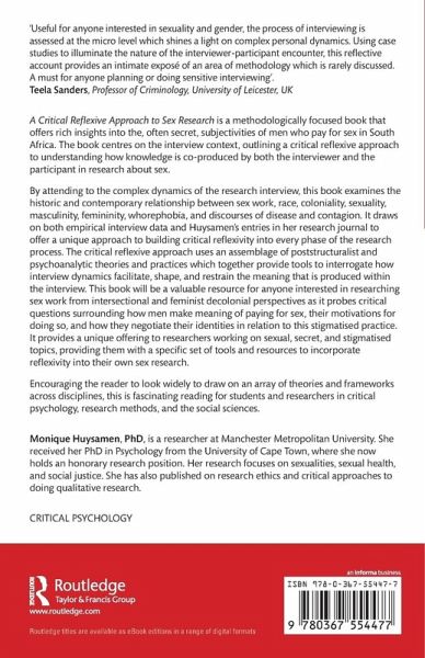 By attending to the complex dynamics of the research interview, this book examines the historic and contemporary relationship between sex work, race, coloniality, sexuality, masculinity, femininity, whorephobia, and discourses of disease and contagion. It draws on both empirical interview data and Huysamen's entries in her research journal to offer a unique approach to building critical reflexivity into every phase of the research process. The critical reflexive approach uses an assemblage of poststructuralist and psychoanalytic theories and practices which together provide tools to interrogate how interview dynamics facilitate, shape, and restrain the meaning that is produced within the interview. This book will be a valuable resource for anyone interested in researching sex work from intersectional and feminist decolonial perspectives as it probes critical questions surrounding how men make meaning of paying for sex, their motivations for doing so, and how they negotiate their identities in relation to this stigmatised practice. It provides a unique offering to researchers working on sexual, secret, and stigmatised topics, providing them with a specific set of tools and resources to incorporate reflexivity into their own sex research.