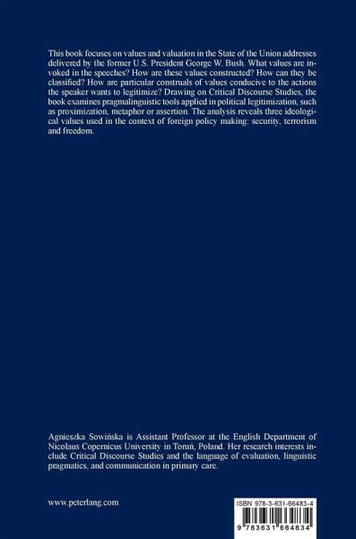 This book focuses on values and valuation in the State of the Union addresses delivered by the former U.S. President George W. Bush. What values are invoked in the speeches? How are these values constructed? How can they be classified? How are particular construals of values conducive to the actions the speaker wants to legitimize? Drawing on Critical Discourse Studies, the book examines pragmalinguistic tools applied in political legitimization, such as proximization, metaphor or assertion. The analysis reveals three ideological values used in the context of foreign policy making: security, terrorism and freedom.