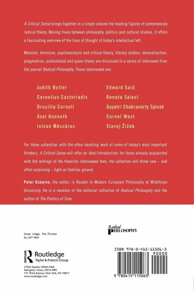 A Critical Sense brings together in a single volume the leading figures of contemporary radical theory. Moving freely between philosophy, politics and cultural studies, it offers a fascinating overview of the lines of thought of today's intellectual left. Marxism, feminism, psychoanalysis and critical theory, literary studies, deconstruction, pragmatism, postcolonial and queer theory are discussed in a series of interviews from the journal Radical Philosophy. Those interviewed are: Judith Butler Cornelius Castoriadis Drucilla Cornell Axel Honneth Istvan Meszaros Edward Said Renata Salecl Gayatri Chakravorty Spivak Cornel West Slavoj Zizek For those unfamiliar with the often daunting work of some of today's most important thinkers, ACritical Sense will offer an ideal introduction; for those already acquainted with the writings of the theorists interviewed here, the collection will throw new - and often surprising - light on familiar ground.