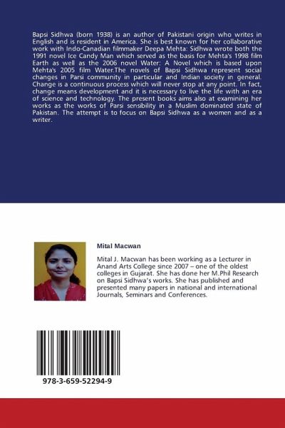 Bapsi Sidhwa (born 1938) is an author of Pakistani origin who writes in English and is resident in America. She is best known for her collaborative work with Indo-Canadian filmmaker Deepa Mehta: Sidhwa wrote both the 1991 novel Ice Candy Man which served as the basis for Mehta's 1998 film Earth as well as the 2006 novel Water: A Novel which is based upon Mehta's 2005 film Water.The novels of Bapsi Sidhwa represent social changes in Parsi community in particular and Indian society in general. Change is a continuous process which will never stop at any point. In fact, change means development and it is necessary to live the life with an era of science and technology. The present books aims also at examining her works as the works of Parsi sensibility in a Muslim dominated state of Pakistan. The attempt is to focus on Bapsi Sidhwa as a women and as a writer.