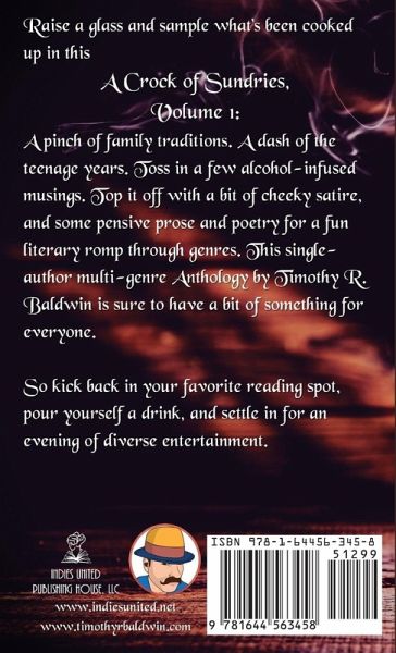 Raise a glass and sample what's been cooked up in this A Crock of Sundries, Volume 1. A pinch of family traditions. A dash of the teenage years. Toss in a few alcohol-infused musings. Top it off with a bit of cheeky satire, and some pensive prose and poetry for a fun literary romp through genres. This single-author multi-genre Anthology by Timothy R. Baldwin is sure to have a bit of something for everyone. ¿So kick back in your favorite reading spot, pour yourself a drink, and settle in for an evening of diverse entertainment.