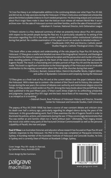 "A Cross Too Heavy, the thoughtful work of the Australian historian Paul O'Shea, provides insight and understanding that might otherwise be lost in the maelstrom of anger still generated by Pius' refusal to issue a clear and unambiguous condemnation of the Nazi campaign of genocide against European Jewry. O'Shea's well-researched and economically written account sheds light not only on the complicated man who became the leader of the world's largest religious body, but the highly complicated and contentious times in which he assumed that leadership. As Jews demand more information on those troubled times and fateful decisions - and as the Roman Catholic Church ponders whether Pius is worthy of sainthood - A Cross Too Heavy is timely, relevant and fascinating." - Intermountain Jewish News
