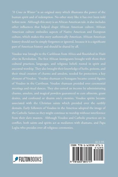 "A Crow in Winter" is an original story which illustrates the power of the human spirit and of redemption. No other story like it has ever been told before now. Although this story is an African American tale, it also includes other influences that helped shape African American culture. African American culture embodies aspects of Native American and European culture, which makes this story authentically American. African American history should not be simply forgotten or ignored, because it is a significant part of American history and should be shared by all. Voudoo was brought to the Caribbean from Africa and flourished in Haiti after its Revolution. The first African immigrants brought with them their cultural practices, languages, and religious beliefs rooted in spirit and ancestral worship. They also brought their knowledge of herbs, poisons, and their ritual creation of charms and amulets, needed for protection; a key element of Voudoo. Voudoo shamaan or honagans became central figures of Voudoo in the Carribean. Voudoo shamaan presided over ceremonial meetings and ritual dances. They also earned an income by administrating charms, amulets, and magical powders guaranteed to cure ailments, grant desires, and confound or disarm one's enemies. Voudoo spirits became associated with the Christian saints which presided over the earthly domain. Early followers of Voudoo in the Americas adopted the image of the Catholic Saints so they might continue to worship without interference from their slave masters. Although Voudoo and Catholic practices are in conflict, both saints and spirits act as mediators with shamans, and Papa Legba who presides over all religious ceremonies.