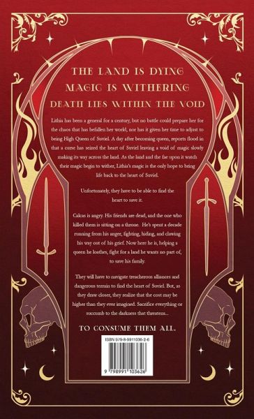 The land is dying.Magic is withering.Death lies within the void. Lithia has been a general for a century, but no battle could prepare her for the chaos that has befallen her world, nor has it given her time to adjust to being High Queen of Suviel. A day after becoming queen, reports flood in that a curse has seized the heart of Suviel leaving a void of magic slowly making its way across the land. As the land and the fae upon it watch their magic begin to wither, Lithia's magic is the only hope to bring life back to the heart of Suviel. Unfortunately, they have to be able to find the heart to save it. Calcas is angry. His friends are dead, and the one who killed them is sitting on a throne. He's spent a decade running from his anger, fighting, hiding, and clawing his way out of his grief. Now here he is, helping a queen he loathes, fight for a land he wants no part of, to save his family. They will have to navigate treacherous alliances and dangerous terrain to find the heart of Suviel but, as they draw closer, they realize that the cost may be higher than they ever imagined. Sacrifice everything or succumb to the darkness that threatens to consume them all.