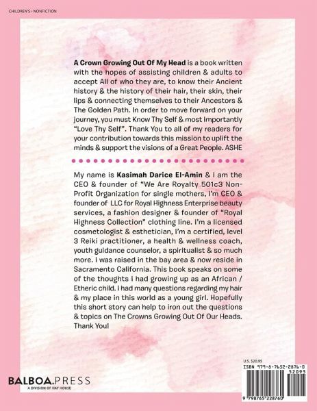 A Crown Growing Out Of My Head is a book written with the hopes of assisting children & adults to accept All of who they are, to know their Ancient history & the history of their hair, their skin, their lips & connecting themselves to their Ancestors & The Golden Path. In order to move forward on your journey, you must Know Thy Self & most Importantly "Love Thy Self". Thank You to all of my readers for your contribution towards this mission to uplift the minds & support the visions of a Great People. ASHE