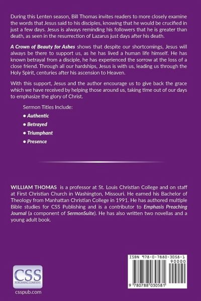 During this Lenten season, Bill Thomas invites readers to more closely examine the words that Jesus said to his disciples, knowing that he would be crucified in just a few days. Jesus is always reminding his followers that he is greater than death, as seen in the resurrection of Lazarus just days after his death. A Crown for Beauty for Ashes shows that despite our shortcomings, Jesus will always be there to support us, as he has lived a human life himself. He has known betrayal from a disciple, he has experienced the sorrow at the loss of a close friend. Through all our hardships, Jesus is with us, leading us through the Holy Spirit, centuries after his ascension to Heaven. With this support, Jesus and the author encourage us to give back the grace which we have received by helping those around us, taking time out of our days to emphasize the glory of Christ. Sermon Titles Include: Authentic Betrayed Triumphant Presence