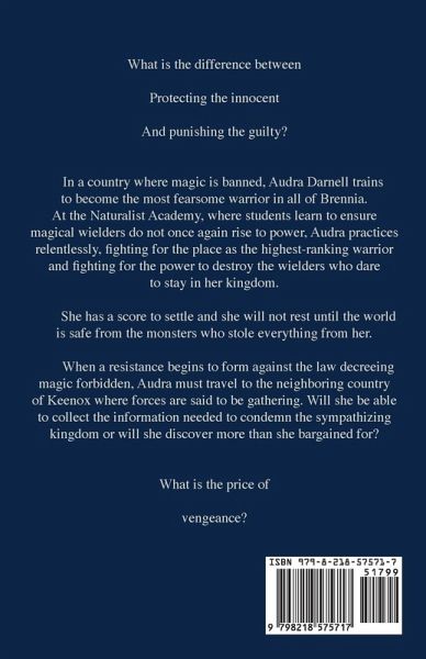 What is the difference between protecting the innocent and punishing the guilty? In a country where magic is banned, Audra Darnell trains to become the most fearsome warrior in all of Brennia. At the Naturalist Academy, where students learn to ensure magical wielders do not once again rise to power, Audra practices relentlessly, fighting for the place as the highest-ranking warrior and fighting for the power to destroy the wielders who dare to stay in her kingdom. She has a score to settle and she will not rest until the world is safe from the monsters who stole everything from her. When a resistance begins to form against the law decreeing magic forbidden, Audra must travel to the neighboring country of Keenox where forces are said to be gathering. Will she be able to collect the information needed to condemn the sympathizing kingdom or will she discover more than she bargained for? What is the price of vengeance?