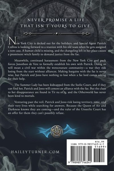 Never promise a life that isn't yours to give. New York City is decked out for the holidays, and Special Agent Patrick Collins is looking forward to a reunion with his old team when he gets assigned a new case. A human child is missing, and the changeling left in her place causes a prominent witch family to demand justice from the fae. Meanwhile, continued harassment from the New York City god pack forces Jonothon de Vere to formally establish his own with Patrick. Doing so will mean a civil war within the werecreature community-a war they risk losing from the start without alliances. Making bargains with the fae is never wise, but Patrick and Jono have nothing to lose when a fae lord comes asking for their help. The Summer Lady has been kidnapped from the Seelie Court, and if they can find her, Patrick and Jono will cement an alliance with the fae. But the clues to her disappearance are found in Tír na nÓg, and the Otherworld has never been kind to mortals. Venturing past the veil, Patrick and Jono risk losing territory, time, and their very lives while searching for answers. Because the Queen of Air and Darkness knows they are coming-and the ruler of the Unseelie Court has an offer for them they can't possibly refuse.