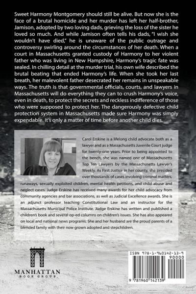Sweet Harmony Montgomery should still be alive. But now she is the face of a brutal homicide and her murder has left her half-brother, Jamison, adopted by two loving dads, grieving the loss of the sister he loved so much. And while Jamison often tells his dads, "I wish she wouldn't have died," he is unaware of the public outrage and controversy swirling around the circumstances of her death. When a court in Massachusetts granted custody of Harmony to her violent father who was living in New Hampshire, Harmony's tragic fate was sealed. In chilling detail at the murder trial, his own wife described the brutal beating that ended Harmony's life. When she took her last breath, her malevolent father desecrated her remains in unspeakable ways. The truth is that governmental officials, courts, and lawyers in Massachusetts will do everything they can to crush Harmony's voice, even in death, to protect the secrets and reckless indifference of those who were supposed to protect her. The dangerously defective child protection system in Massachusetts made sure Harmony was simply expendable. It's only a matter of time before another child dies.