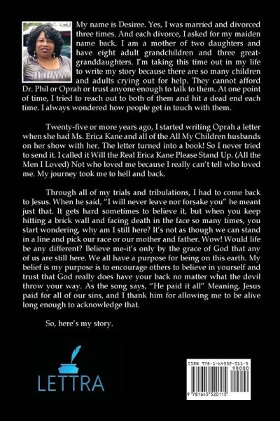 Twenty-five or more years ago, I started writing Oprah a letter when she had Ms. Erica Kane and all of the All My Children husbands on her show with her. The letter turned into a book! So, I never tried to send it. I called it Will the Real Erica Kane Please Stand Up. (All the Men I Loved) Not who loved me because I really can't tell who loved me. My journey took me to hell and back. Through all of my trials and tribulations, I had to come back to Jesus. When he said, "I will never leave nor forsake you" he meant just that. It gets hard sometimes to believe it, but when you keep hitting a brick wall and facing death in the face so many times, you start wondering, why am I still here? It's not as though we can stand in a line and pick our race or our mother and father. Wow! Would life be any different? Believe me-it's only by the grace of God that any of us are still here. We all have a purpose for being on this earth. My belief is my purpose is to encourage others to believe in yourself and trust that God really does have your back no matter what the devil throws your way. As the song says, "He paid it all" Meaning, Jesus paid for all of our sins, and I thank him for allowing me to be alive long enough to acknowledge that. So, here's my story.