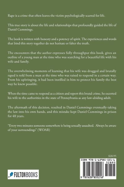 Rape is a crime that often leaves the victim psychologically scarred for life. This true story is about the life and relationships that profoundly guided the life of Daniel Cummings. The book is written with honesty and a potency of spirit. The experiences and words that bind this story together do not hesitate or falter the truth. The encounters that the author expresses fully throughput this book, gives an outline of a young man at the time who was searching for a beautiful life with his wife and family. The overwhelming moments of learning that his wife was drugged and brutally raped is told from a man at the time who was raised to respond in a certain way. From his upbringing, it had been instilled in him to protect his family the best way he knew possible. When the time came to respond as a citizen and report this brutal crime, he escorted his wife to the authorities in the state of Pennsylvania as any law-abiding adult. The aftermath of this decision, resulted in Daniel Cummings eventually taking the law into his own hands, and this mistake kept Daniel Cummings in prison for 48 years. "Every two minutes someone somewhere is being sexually assaulted. Always be aware of your surroundings" (WOAR)