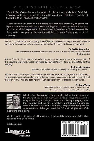 ABOUT THE BOOK: A Cultish Side of Calvinism was first written for the purpose of clarifying Calvinistic theology, but Coate's research led him to the conclusion that it shares significant similarities to unorthodox Christian faiths. Coate's scrutiny will prove to be biblically balanced and practically engaging for anyone remotely interested in Christian theology. As a pastor, speaker, and hospital chaplain, Micah has experienced firsthand Calvinism's effect in Christian culture. He clearly writes how you can beware the pitfalls of Calvinism's overly systematized theology. If the rise of a cultish theology grows within Christendom, so must a true discernment of its claims and consequences. The same standard that has placed Mormons, Jehovah's Witnesses, and Scientologists outside the Christian camp of orthodoxy has now, for the first time, placed the theology of Calvinism as being too cultish for comfort. Unlike any other book on the market, A Cultish Side of Calvinism not only shows that the theology of Calvinism is more systematic than biblical, but that it is comparable to almost any classic Christian cult. Most people know that Evangelical Christianity has rightly denounced theologies that differ in the essentials of the faith. Yet, due to its foothold on Christian 'orthodoxy', the theology of Calvinism has mainly gone unnoticed, leaving many young Christians unaware of the veiled and yet essential claims of their newly found theology. The September 2006 issue of Christianity Today sums up the previous claims that Calvinism is growing among a new generation of Christians. The story's title says it all: "Young, Restless, Reformed. Calvinism is making a comeback-and shaking up the church." If the claims of this book go unchecked and Calvinism is indeed "shaking up the church", we should fear that it will tragically break up the body of Christ even further. **** ABOUT THE AUTHOR: Whether in a classroom or a church setting, Micah desires to present the claims of the Bible in relevant and honest ways. He makes the study of theology and religion practical and freshly engaging. Other than speaking and writing on theology, Micah is also building an archive of articles on politics and ethics emphasizing the place for common sense. His hunger to seek God's Truth in all spheres of life is captivating and exciting. Micah is married with one child. He enjoys music, art, and the outdoors. In his free time he likes to work on his house. micahcoate.com