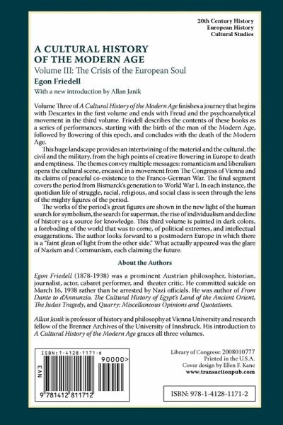 Volume three of A Cultural History of the Modern Age finishes a journey that begins with Descartes in the first volume and ends with Freud and the psychoanalytical movement in the third volume. Friedell describes the contents of these books as a series of performances, starting with the birth of the man of the Modern Age, followed by flowering of this epoch, and concludes with the death of the Modern Age.