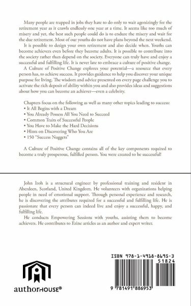 Many people, like my colleague, are trapped in jobs they hate to do only to wait agonizingly for the retirement year as it crawls endlessly one year at a time. It seems like too much of misery and yet, the best such people could do is to endure the misery and wait for the due retirement. Most of our youths do not have plans beyond the next weekend. It is possible to design your own retirement and also decide when. Youths can become achievers even before they become adults. It is possible to contribute into the society rather than depend on the society. Everyone can truly have and enjoy a successful and fulfilling life. It is never late to embrace a culture of positive change. A Culture of Positive Change explores your potential-a resource that every person has, to achieve success. It provides guidance to help you discover your unique purpose for living. The wisdom and advice presented on every page challenge you to activate the rich deposit of ability within you and also provides ideas and suggestions about how you can become an achiever-even a celebrity. Chapters focus on the following as well as many other topics leading to success: ¿ It All Begins with a Dream ¿ You Already Possess All You Need to Succeed ¿ Common Traits of Successful People ¿ You Have to Make the Hard Decisions ¿ Hints on Discovering Who You Are ¿ 150 "Success Nuggets" A Culture of Positive Change contains all of the key components required to become a truly prosperous, fulfilled person. You were created to be successful!