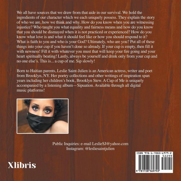 We all have sources that we draw from that aide in our survival. We hold the ingredients of our character which we each uniquely possess. They explain the story of who we are, how we think and why. How do you know when you are witnessing injustice? Who taught you what equality and fairness means and how do you know that you should be dismayed when it is not practiced or experienced? How do you know what love is and what it should feel like or how you should respond to it? What is faith to you and who is your God? Ultimately, who are you? Put all of these things into your cup if you haven't done so already. If your cup is empty, then fill it with newness! Fill it with whatever you must that will keep your fire going and your heart spiritually beating! Lastly, always be yourself and drink only from your cup and no one else's. This is... a cup of me. Sip slowly!
