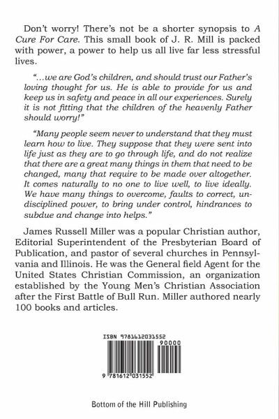 Don't worry! There's not be a shorter synopsis to A Cure For Care. This small book of J. R. Mill is packed with power, a power to help us all live far less stressful lives. "...we are God's children, and should trust our Father's loving thought for us. He is able to provide for us and keep us in safety and peace in all our experiences. Surely it is not fitting that the children of the heavenly Father should worry!" "Many people seem never to understand that they must learn how to live. They suppose that they were sent into life just as they are to go through life, and do not realize that there are a great many things in them that need to be changed, many that require to be made over altogether. It comes naturally to no one to live well, to live ideally. We have many things to overcome, faults to correct, undisciplined power, to bring under control, hindrances to subdue and change into helps." James Russell Miller was a popular Christian author, Editorial Superintendent of the Presbyterian Board of Publication, and pastor of several churches in Pennsylvania and Illinois. He was the General field Agent for the United States Christian Commission, an organization established by the Young Men's Christian Association after the First Battle of Bull Run. Miller authored nearly 100 books and articles.