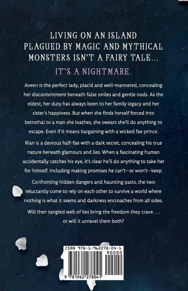 Living on an island plagued by magic and mythicalmonsters isn't a fairy tale... it's a nightmare. Aveen is the perfect lady, placid and well-mannered, concealing her discontentment beneath false smiles and gentle nods. As the eldest, her duty has always been to her family legacy and her sister's happiness. But when she finds herself forced into betrothal to a man she loathes, she swears she'll do anything to escape. Even if it means bargaining with a wicked fae prince. Rían is a devious half-fae with a dark secret, concealing his true nature beneath glamours and lies. When a fascinating human accidentally catches his eye, it's clear he'll do anything to take her for himself. Including making promises he can't-or won't-keep. Confronting hidden dangers and haunting pasts, the two reluctantly come to rely on each other to survive a world where nothing is what it seems and darkness encroaches from all sides. Will their tangled web of lies bring freedom they crave.. or will it unravel them both?